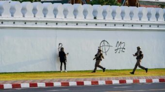 Em vídeos da prisão que circulam online, a polícia é vista abordando o homem depois que ele desenha um círculo ao redor da letra ‘A’ – representando o anarquismo – e os números “112” tachados – uma referência à Seção 112 do Código Penal da Tailândia, uma lei real de difamação frequentemente usada contra ativistas pró-democracia.
