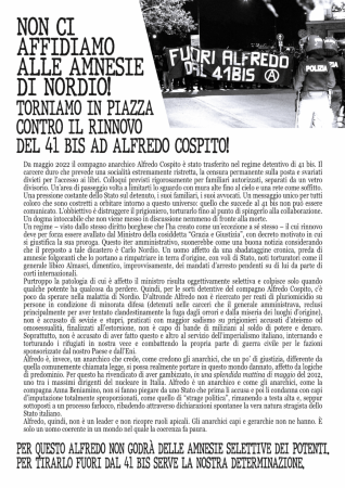 Desde maio de 2022, o companheiro anarquista Alfredo Cospito foi transferido para o regime prisional de 41 bis. O cárcere duro que prevê uma socialidade extremamente restrita, a censura permanente sobre a correspondência e diversos impedimentos para o acesso a livros. Refeitórios realizados rigorosamente com familiares autorizados, separados por um vidro à prova de balas. Uma área de passeio projetada para limitar seu olhar com muros altos até o céu e uma rede como teto. Uma pressão constante do Estado sobre o detento, seus familiares, seus advogados. Uma única mensagem para todos aqueles que são forçados a orbitar em torno desse universo: o que acontece no 41 bis não pode ser comunicado. O objetivo é destruir o prisioneiro, torturá-lo a ponto de levá-lo à colaboração. Um dogma intocável que não é questionado nem mesmo diante da morte.